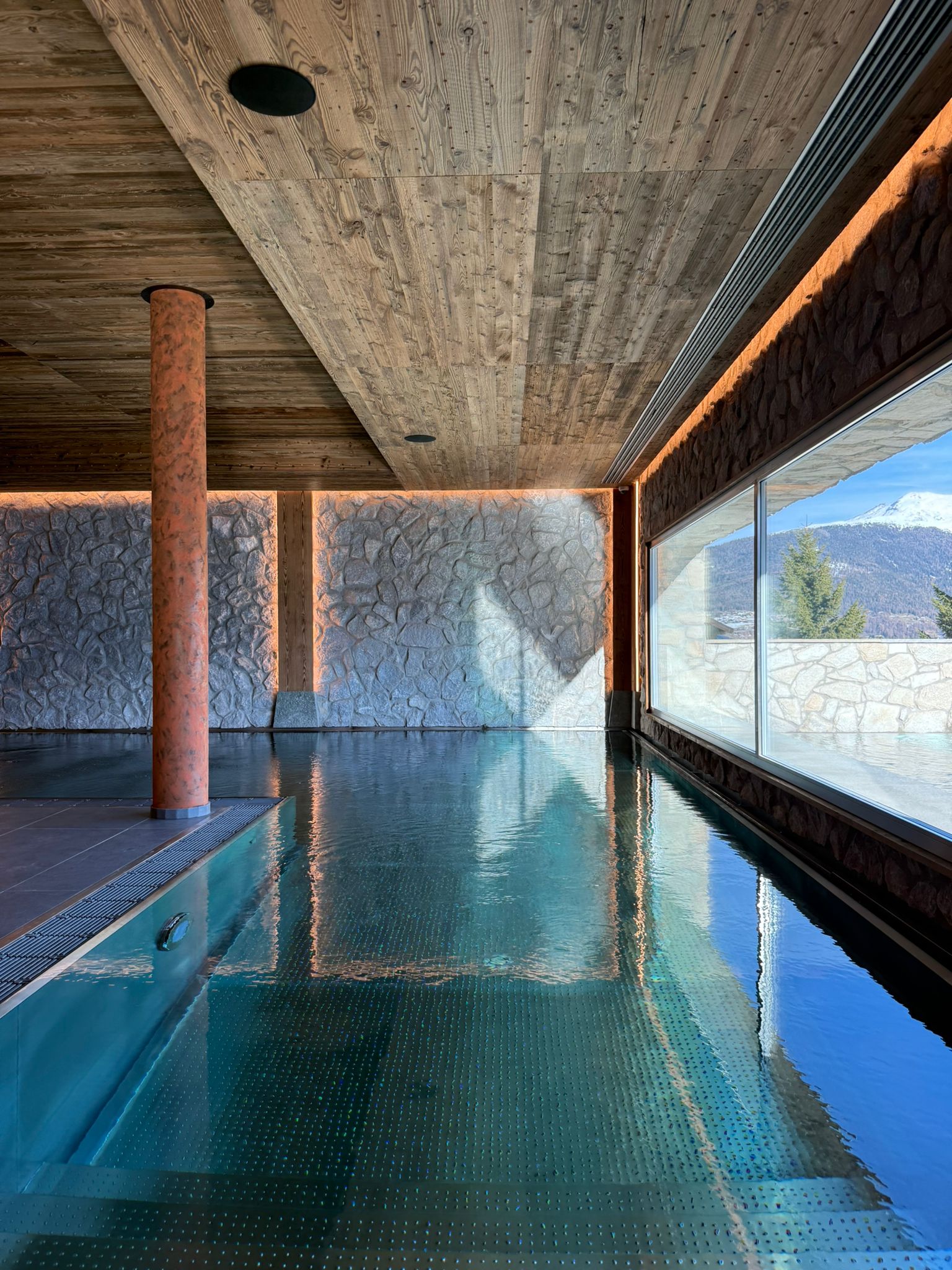 La piscine intérieure enveloppe de chaleur et de sérénité, tandis que la piscine extérieure permet de profiter de l’air pur de la montagne dans un cadre exceptionnel.